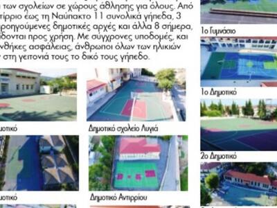 Συνολικά αυτή τη στιγμή έχουν αποδοθεί από το Αντίρριο ως τη Ναύπακτο έντεκα σύγχρονοι και ασφαλείς χώροι άθλησης, τρεις από προηγούμενες θητείες και οκτώ από την παρούσα, οι οποίοι καθημερινά αποτελούν σημείο συνάντησης δεκάδων πολιτών. Πρόκειται για τα προαύλια των εξής σχολείων: Δημοτικό και Γυμνάσιο Αντιρρίου, 1ο Λύκειο, ΕΠΑΛ, 1ο Δημοτικό, 2ο Δημοτικό, 3ο Δημοτικό, 4ο Δημοτικό, 5ο Δημοτικό, 6ο Δημοτικό, Δημοτικό Λυγιά.
