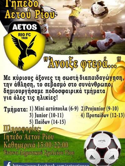 Ο Αετός Ρίου συνεχίζει για 4η χρονιά τα τμήματα υποδομής της ποδοσφαιρικής ομάδας. Με τη στήριξη της τοπικής κοινωνίας και του Δήμου της Πάτρας.