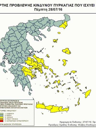 Yψηλό κίνδυνο πυρκαγιάς προβλέπει για σήμερα Πέμπτη 28 Ιουλίου, η Γενική Γραμματεία Πολιτικής Προστασίας (ΓΓΠΠ) σε αρκετές περιοχές της Ελλάδας.