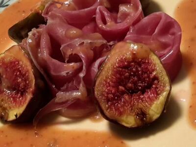 Σε μια μεγάλη πιατέλα τοποθετούμε στη μέση τις φέτες του προσούτο και περιμετρικά τα ψημένα σύκα. Περιχύνουμε με τη σάλτσα μας τις φέτες του προσούτο και τα σύκα.