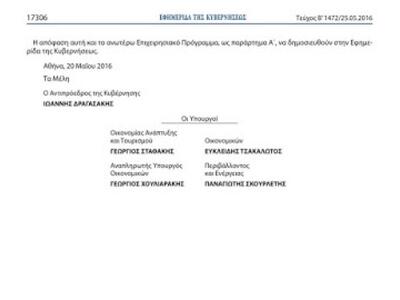 Στις 25 Μαΐου η κυβέρνηση δημοσιοποίησε την απόφαση στην Εφημερίδα της Κυβέρνησης, την οποία υπογράφουν ο αντιπρόεδρος Γιάννης Δραγασάκης και οι υπουργοί Σταθάκης (Οικονομίας), Τσακαλώτος (Οικονομικών), Σκουρλέτης (Περιβάλλοντος) και ο αναπληρωτής Οικονομικών Γ.Χουλιαράκης.