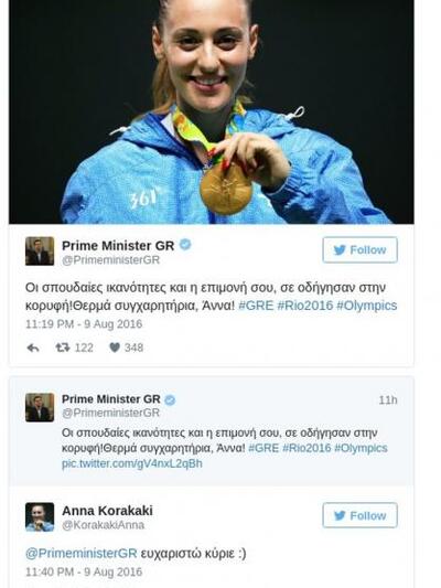 Ο πρωθυπουργός Αλέξης Τσίπρας ήταν από τους πρώτους που έσπευσαν να συγχαρούν τη χρυσή ολυμπιονίκη του Ρίο Αννα Κορακάκη.Ο κ. Τσίπρας έγγραψε στο Τwitter: «Οι σπουδαίες ικανότητες και η επιμονή σου, σε οδήγησαν στην κορυφή! Θερμά συγχαρητήρια, Άννα!».