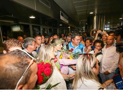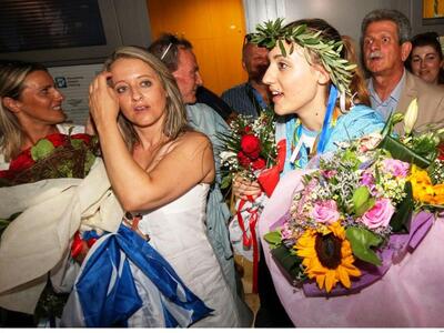 Η Άννα Κορακάκη, κατέβηκε από το αεροπλάνο που τη μετέφερε από την Αθήνα στη Θεσσαλονίκη, μαζί με τον πατέρα της. Όπως φαίνεται και στα πλάνα της ιστοσελίδας voria.gr αμέσως την πλησίασε ο αδελφός και της φόρεσε ένα στεφάνι και της χάρισε μία ζεστή αγκαλιά. Στη συνέχεια η χρυσή Ολυμπιονίκης «χάθηκε» στην αγκαλιά της περήφανης μητέρας της.