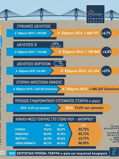 Σύμφωνα με τους πίνακες που παρουσίασε η εταιρία οι συνολικές διευλέσεις το Α’ εξάμηνο του 2015 ήταν 1.393.082 ενώ το Α’ εξάμηνο του 2016 έφθασαν στις 1.486.972. Σε έναν άλλο πίνακα υπό τον τίτλο «ιστορική αντιστοιχαία αναλογίας κίνησης», αναφέρεται ότι το Α’ εξάμηνο του 2013 οι διελεύσεις από την Γέφυρα Ρίου-Αντιρρίου ήταν 1.444.247.