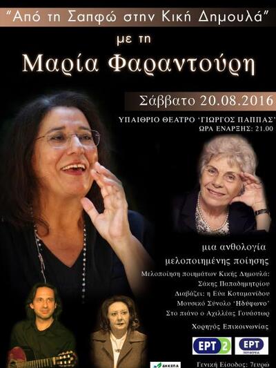 Η κορυφαία ερμηνεύτρια Μαρία Φαραντούρη και η σπουδαία ηθοποιός Εύα Κοταμανίδου, συναντούν τη μελοποιημένη ποίηση της Κικής Δημουλά από τον συνθέτη Σάκη Παπαδημητρίου απόψε (Σάββατο 20 Αυγούστου στις 9 μ.μ.) στο Υπαίθριο Θέατρο «Γιώργος Παππάς» στο Αίγιο.