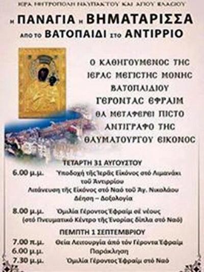 Η Ιερά Μητρόπολη Ναυπάκτου και Αγίου Βλασίου καλεί στην Υποδοχή της Ιεράς Εικόνας της Παναγίας της Βηματάρισσας, από το Βατοπαίδι, στο Λιμανάκι του Αντιρρίου και στη Λιτάνευση της Εικόνας στο Ναό του Αγίου Νικολάου.