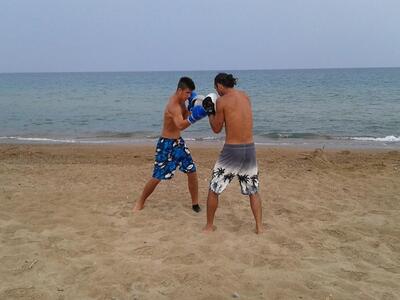 Ο Λάμπρος Μιχαλόπουλος πραγματοποιεί καλοκαιρινό καμπ για όσους αθλητές και αθλήτριες θέλουν να γνωρίζουν τα μυστικά της πυγμαχίας, στην παραλία Σαβάλια. Ωστόσο δεν θα μπορούσαμε στις φωτογραφίες του καμπ να μην σταθούμε σε αυτές τις φωτογραφίες, όπου ο Λάμπρος Μιχαλόπουλος κάνει στόχους με τον γιο του Μάρκου.