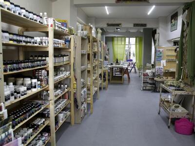 Υπαρχουν πιστοποιημενα υλικα χειροτεχνιας (ακρυλικα χρωματα, κρακελε, χρυσωμα, powertex,πηλινα, ξυλινα και γυαλινα αντικειμενα, mdf επιφανειες και τελος μεγαλη ποικιλια απο χαρτοπετσες και ριζοχαρτα).