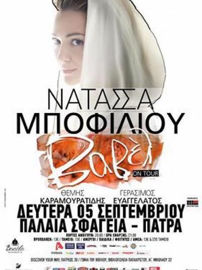 Ύστερα από τις sold out παραστάσεις του χειμώνα που συζητήθηκαν όσο λίγες στην Αθήνα, η Νατάσσα Μποφίλιου, ο Θέμης Καραμουρατίδης και ο Γεράσιμος Ευαγγελάτος παρουσιάζουν την ξεχωριστή ΒΑΒΕΛ σε όλη την Ελλάδα. Την Δευτέρα 5 Σεπτεμβρίου εμφανίζονται στα Παλαιά Σφαγεία Πατρών.