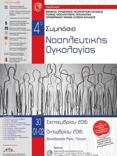 O Τομέας Νοσηλευτικής Ογκολογίας του Εθνικού Συνδέσμου Νοσηλευτών Ελλάδος θα πραγματοποιήσει το  4ο Συμπόσιο Νοσηλευτικής Ογκολογίας στις 30 Σεπτεμβρίου - 2 Οκτωβρίου 2016 στο Ξενοδοχείο Astir στην Πάτρα.
