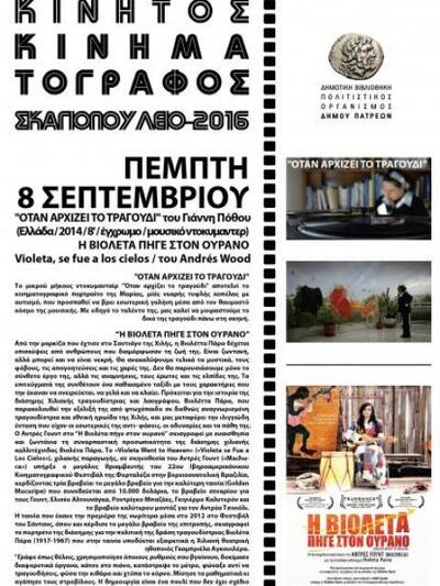 Ο θερινός κινητός κινηματογράφος, η ωραία αυτή ιδέα του Πολιτιστικού Οργανισμού του Δήμου Πατρέων και του γνωστού σινεφίλ Νίκου Καββαδία, συνεχίζει τις προβολές του, με ελεύθερη είσοδο, για το κοινό στις γειτονιές της Πάτρας. Την Πέμπτη 8 Σεπτεμβρίου 2016 ο θερινός κινητός κινηματογράφος θα βρίσκεται στον κήπο του Σκαγιοπουλείου, όπου στις 9.30 το βράδυ θα προβληθούν οι ταινίες «Όταν αρχίζει το τραγούδι» και «Η Βιολέτα πήγε στον ουρανό», η οποία είχε προβληθεί στο Φεστιβάλ ανεξάρτητου σινεμά του Σάντανς στη Γιούτα και μάλιστα είχε βραβευτεί με το μεγάλο βραβείο της κριτικής επιτροπής.