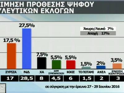 Με δέκα ποσοστιαίες μονάδες προηγείται η Νέα Δημοκρατία του ΣΥΡΙΖΑ στην πρόθεση ψήφου, συγκεντρώνοντας το 27,5% έναντι 17,5% που συγκεντρώνει η Κουμουνδούρου, σύμφωνα με την τελευταία δημοσκόπηση του Πανεπιστημίου Μακεδονίας για λογαριασμό του ΣΚΑΪ. Τρίτο κόμμα παραμένει η Χρυσή Αυγή με ποσοστό 7,5% και ακολουθούν Δημοκρατική Συμπαράταξη και ΚΚΕ με 5,5% αμφότερα.