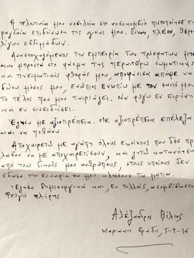 Αργά το απόγευμα του Σαββάτου πήρε εξιτήριο. Πριν, τον επισκέφτηκαν κάμποσοι φίλοι και τον αποχαιρέτησαν. Πολλοί από αυτούς κλαίγοντας. «Δεν μπορώ να το καταλάβω αυτό». Στις 9.30 χτύπησα το κουδούνι. Μου άνοιξε ένα γλυκύτατο πλάσμα. Η εξάχρονη κορούλα του. Εκείνος καθόταν στο γραφείο του. «Έλα να σου δείξω τι θέλω να πω». Μου διάβασε λίγες γραμμές από ένα χειρόγραφο κείμενο. «Δεν έχει νόημα Αλέξανδρε, τα έχεις πει όλα, επαναλαμβάνεσαι». «Συμφωνώ, απλώς ήθελα να μου το επιβεβαιώσεις». Σηκώθηκε, με μεγαλύτερη δυσκολία από κάθε άλλη φορά, και κάθισε απέναντί μου. «Είσαι ένας από τους λίγους ανθρώπους που σε λίγο θα γνωρίζουν τα πάντα. Το τελικό πια σχέδιο. Είναι δικαίωμά σου να παραδεχθείς ότι γνώριζες ή όχι. Αύριο θα πεθάνω. Όχι ακριβώς όπως θα ήθελα, δηλαδή με ευθανασία, αλλά με ΜΗ υποβοηθούμενη ευθανασία. Δηλαδή –για να μην μασάω τα λόγια μου- θα αυτοκτονήσω. Θες να σου διαβάσω την στερνή ανακοίνωσή μου; Άνοιξε την καμερούλα σου».