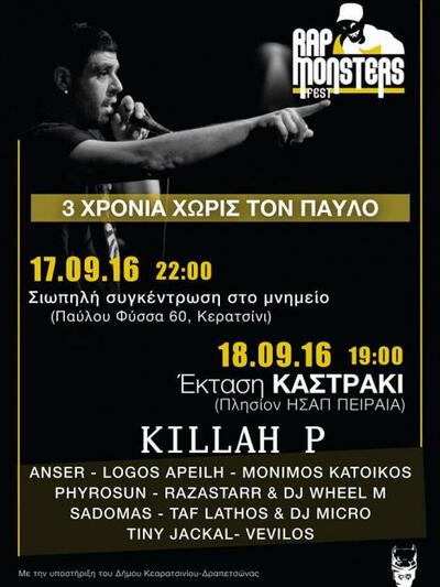 Η οικογένεια και οι φίλοι του Παύλου Φύσσα με δελτίο τύπου που εξέδωσαν στα social media, καλούν τον κόσμο σε σιωπηλή συγκέντρωση, το βράδυ της 17ης Σεπτέμβρη, στο σημείο της δολοφονίας του μουσικού (Ώρα 22:00, στην οδό Παύλου Φύσσα 60, στο Κερατσίνι), και την επομένη, στο Rap Monsters Festival, μια διοργάνωση που ξεκίνησε ο Παύλος και συνεχίζουν οι φίλοι του, με σκοπό την συσπείρωση και ενεργοποίηση της νεολαίας για θέματα αλληλεγγύης (Ώρα 19:00, στην έκταση «Καστράκι» - πλησίον ΗΣΑΠ Πειραιά, έναντι πύλης Ε2).