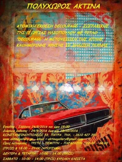 Η ατομική έκθεση της Γιωργίας Ηλιοπούλου με τίτλο: "Decoupage: Η μετουσίωση της απλής καθημερινής χρήσης σε δήλωση τέχνης» εγκαινιάζεται στις 24 Σεπτεμβρίου στην Πάτρα. Η έκθεση θα πραγματοποιηήθει στον Πολυχώρο "Ακτίνα" έως τις 15 Οκτωβρίου.