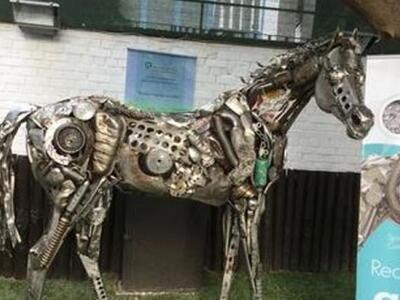 Είναι φτιαγμένο από αμορτισέρ, εξατμίσεις, κομμάτια από κινητήρες αυτοκινήτων, κουτάλες και ό,τι άλλο παλιοσίδερο καταλήγει στην ανακύκλωση. Το 300 κιλών μεταλλικό άλογο, σε φυσική διάσταση, που δεσπόζει στον υπαίθριο χώρο, απέναντι από τον πύργο του ΟΤΕ, στο περίπτερο του Δήμου Θεσσαλονίκης, για την ανακύκλωση και το αστικό περιβάλλον, τραβάει όλα τα βλέμματα των επισκεπτών της 81ης ΔΕΘ.