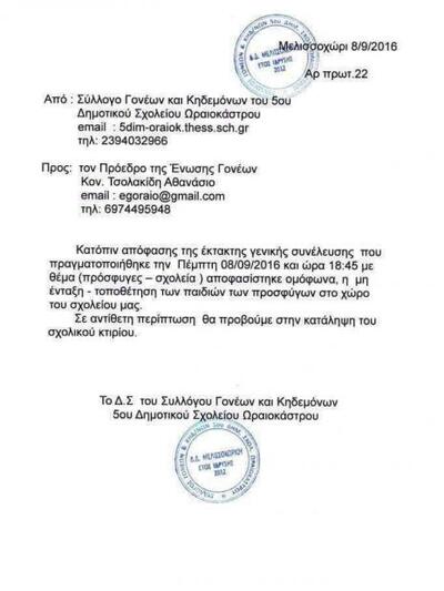 Σάλο έχει προκαλέσει στο διαδίκτυο η ομόφωνη!!! απόφαση του Συλλόγου Γονέων και Κηδεμόνων του 5ου Δημοτικού Σχολείου Ωραιοκάστρου που ζητά να μην ενταχθούν παιδιά - πρόσφυγες στο σχολείο και απειλούν με κατάληψη. Αντίστοιχη απόφαση - ντροπή, είχε πάρεικαι το 1ο Δημοτικό Σχολείο της περιοχής.