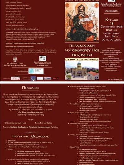 Η εκδήλωση θα πραγματοποιηθεί αυτή την Κυριακή 18 Σεπτεμβρίου 2016, στις 8:00 μ.μ. στον αύλειο χώρο του Ιερού Ναού Αγίου Ανδρέου Πατρών, με είσοδο ελεύθερη για το κοινό.