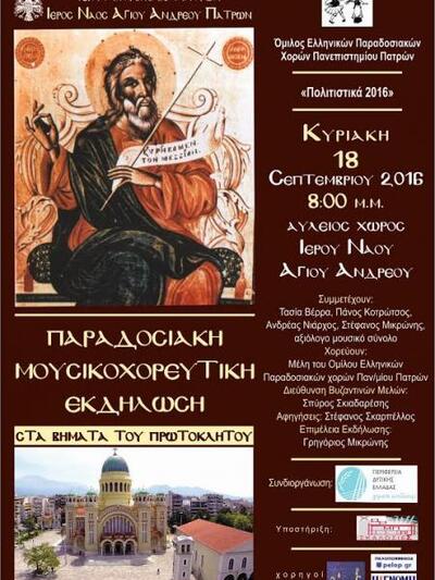 Όπως ήδη έχει γράψει το thebest.gr, με την ευλογία του Σεβασμιοτάτου Μητροπολίτου Πατρών κ.κ. Χρυσοστόμου, το Εκκλησιαστικό Συμβούλιο του Ιερού Ναού Αγίου Ανδρέου Πατρών, στο πλαίσιο των εκδηλώσεων του εορτασμού της Επανακομιδής της Τίμιας Κάρας του Αγίου Ανδρέου και ο Όμιλος Ελληνικών Παραδοσιακών Χορών του Πανεπιστημίου Πατρών, στο πλαίσιο των «Πολιτιστικών 2016» της Επιτροπής Πολιτιστικής Ανάπτυξης του Πανεπιστημίου Πατρών, συνδιοργανώνουν με την Περιφέρεια Δυτικής Ελλάδος, μία ανοιχτή ξεχωριστή παραδοσιακή μουσικοχορευτική εκδήλωση με ποικίλο περιεχόμενο και με θέμα: «Στα βήματα του Πρωτοκλήτου».