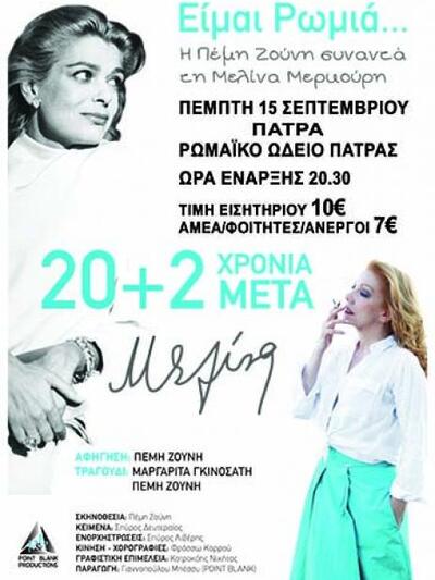 «Η Πέμη Ζούνη συναντά τη Μελίνα Μερκούρη» είναι ο τίτλος της παράστασης που είναι αφιερωμένη στη ζωή και το έργο της Μελίνας Μερκούρη, που έφυγε από κοντά μας πριν από 20 +2 χρόνια. Μία παράσταση που αναδεικνύει την πορεία της σημαντικής αυτής Ελληνίδας, που αγωνίστηκε διεθνώς για την προβολή της χώρας μας και του ελληνικού Πολιτισμού! Την Πέμπτη 15 Σεπτεμβρίου θα βρεθεί στο Αρχαίο Ωδείο της Πάτρας.
