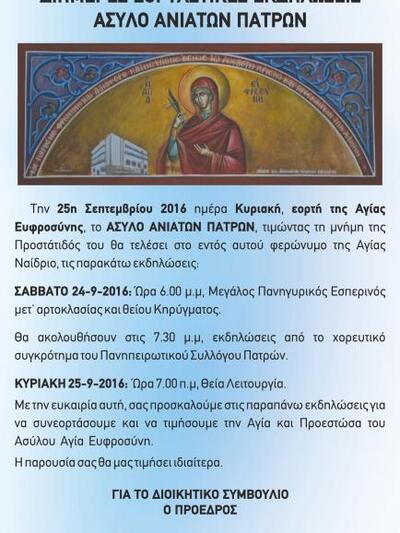 Την προστάτιδά του Αγία Ευφροσύνη γιορτάζει το Άσυλο Ανιάτων Πατρών στις 24 και 25 Σεπτεμβρίου.