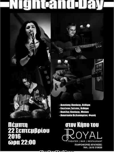 Αυτή την Πέμπτη 22 Σεπτεμβρίου 2016 στις 10 το βράδυ οι Night And Day περιμένουν το κοινό στο Up Stage του Royal Theater (στο Παλαιό Πτωχοκομείο, στην Ακτή Δυμαίων, στην Πάτρα) όπου θα παρουσιάσουν ένα live με ρυθμούς Gypsy Swing με στόχο να απογειώσουν την διάθεση.