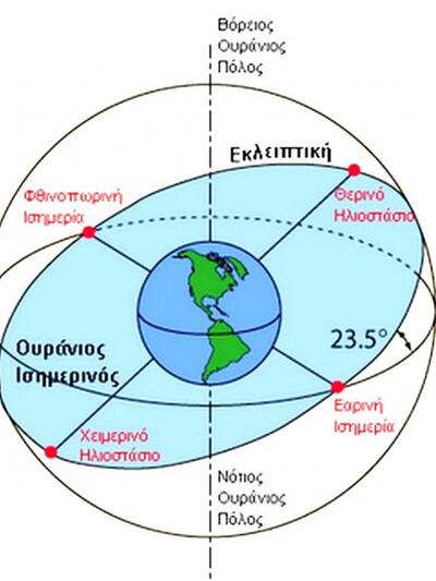 Αν παρατηρήσουμε την εκλειπτική και τη συγκρίνουμε με τον ουράνιο ισημερινό (την προέκταση δηλαδή του ισημερινού της Γης και την αποτύπωσή του πάνω στον ουράνιο θόλο) θα δούμε ότι οι δύο αυτοί κύκλοι δε συμπίπτουν, αλλά αντίθετα τέμνονται, σχηματίζοντας γωνία ίση με 23 μοίρες και 27 πρώτα λεπτά, λόγω της κλίσης που έχει ο άξονας της Γης σε σχέση με το επίπεδο που σχηματίζει η εκλειπτική.