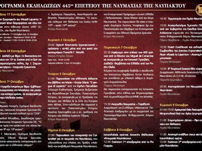 Οι εκδηλώσεις εις ανάμνηση της Ναυμαχίας της 7ης Οκτωβρίου του 1571, ήδη ξεκίνησαν και θα διαρκέσουν, σύμφωνα με το πρόγραμμα έως και την Κυριακή 9 Οκτωβρίου 2016. Φυσικά η κορυφαία στιγμή κάθε χρόνο είναι η τελετή της αναπαράστασης της Ναυμαχίας που φέτος θα πραγματοποιηθεί το Σάββατο 8/10 στις 20.30 στο λιμάνι της Ναυπάκτου.