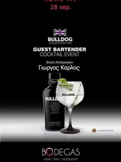 Ο grand ambassador του Bulldog σημερα το βράδυ μαζί μας για να απολαύσουμε επιλεγμένες συνταγές με Bulldog London dry gin σε μια βραδια γεματη σπανιες και πρωτοτυπες γευσεις μοναδικες για την πολη μας με την σφραγιδα bodegas.