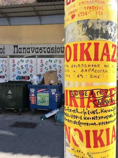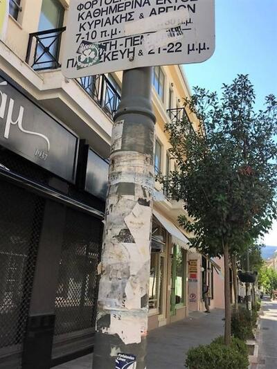 Μαζί με αφίσες που κολλούνται όπου να'ναι, αυτή την περίοδο ο τόπος έχει γεμίσει και με ενοικιαστήρια που 'χάσκουν' μισοσκισμένα σε κολώνες φωτισμού, τηλεφωνικούς θαλάμους και...ταχυδρομικά κουτιά! Από την άλλη, δεν έχουν δημιουργηθεί από τον Δήμο (όπως προβλέπει ο κανονισμός) ειδικά πλαίσια διαφημίσεων ώστε να μπει η κατάσταση πλέον σε μια τάξη και έτσι, αυτή η πολύχρωμη και παράλληλα αντιαισθητική εικόνα εξαπλώνεται. Θαυμάστε" εικόνες από το κέντρο του Αιγίου. Και μετά ας ντραπούμε όλοι μαζί γι'αυτό το χάλι.