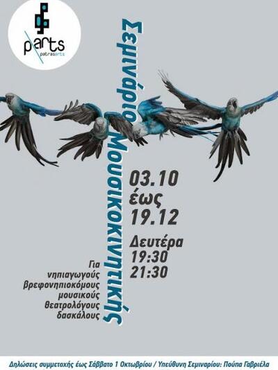 Το Parts-Patras arts στην Πάτρα ξεκινά ένα νέο κύκλο σεμιναρίων μουσικοκινητικής αγωγής που θα διαρκέσει από τις 3 Οκτωβρίου έως και τις 19 Δεκεμβρίου 2016 και θα γίνεται κάθε Δευτέρα 19:30-21:30.