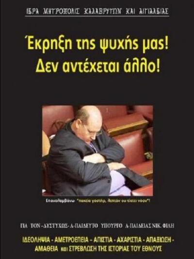 Ο κ. Φίλης είπε ότι «ο Αμβρόσιος κυκλοφόρησε φυλλάδιο στην επαρχία του με φωτογραφία μου. Με αποκαλεί φίδι και έχει ένα γνωμικό -δεν ξέρω πού το βρήκε- ότι όλοι οι χοντροί είναι βλάκες. Τόσο προσβλητική επίθεση. Όχι απέναντι σε μένα. Απέναντι στους ανθρώπους που είναι υπέρβαροι.
