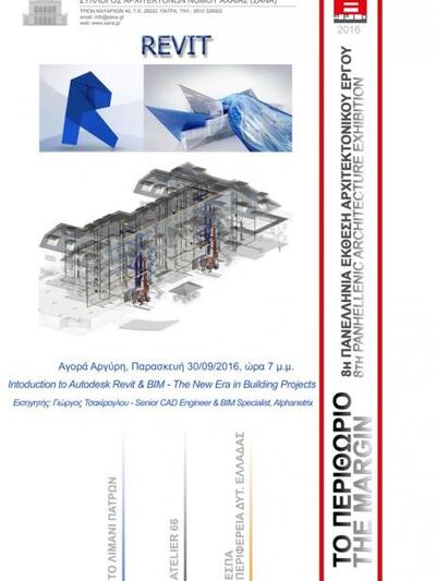 «Ο Σύλλογος Αρχιτεκτόνων Νομού Αχαΐας (ΣΑΝΑ) και η εταιρεία Alphanetrix, μοναδικός Autodesk Gold Partner στην Ελλάδα, σας προσκαλούν την εκδήλωση που διοργανώνουν με θέμα «Introduction to Autodesk Revit & BIM – The New Era in Building Projects», η οποία θα πραγματοποιηθεί την Παρασκευή 30 Σεπτεμβρίου στις 19:00, στην Αγορά Αργύρη, στο πλαίσιο της 8ης Πανελλήνιας Έκθεσης Αρχιτεκτονικού Έργου «Το Περιθώριο».