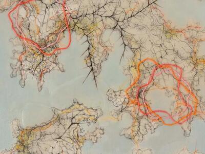 Μια κλωστή ή ένα νήμα, πότε λεπτή κι αδιόρατη, πότε έντονη, κατακόκκινη, να πλέκεται και να τυλίγεται σα δίκτυ ανάμεσα σε σχήματα και χάρτες, να τα αγκαλιάζει και να παίζει, να διαλέγεται μαζί τους ή πιο συχνά να αντιπαρατίθεται. Σχήματα όπως τα γεωμετρικά ή σαν κι αυτά που μηχανικά κι ασυνείδητα χαράσσει κανείς, όταν συλλογίζεται μοναχός ή όταν επικοινωνεί με κάποιον άλλο που τον χωρίζει μαζί του μια τηλεφωνική γραμμή.