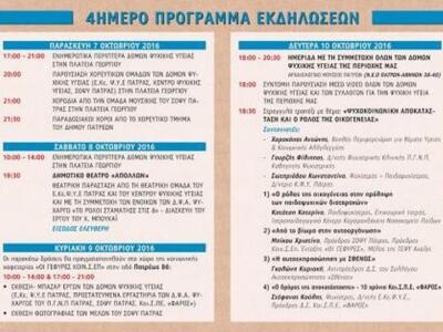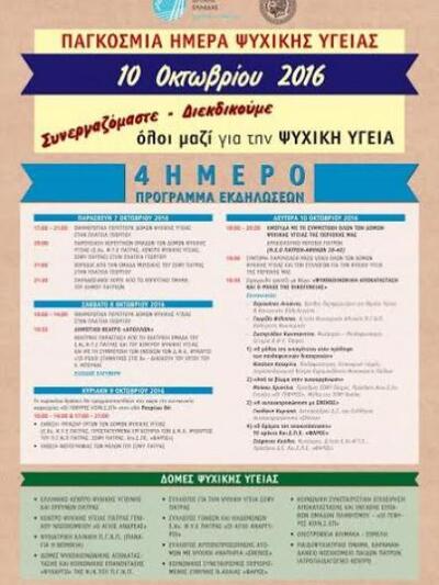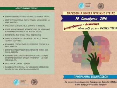 Όλες οι Δομές Ψυχικής Υγείας της περιοχής μας διοργανώνουν 4ημερο πρόγραμμα εκδηλώσεων με συνδιοργανωτή την Περιφέρεια Δυτικής Ελλάδος και με την υποστήριξη του Δήμου Πατρέων. Αφορμή η παγκόσμια ημέρα ψυχικής υγείας στις 10 Οκτωβρίου.