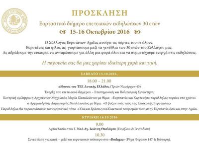 Ο Σύλλογος Ευρυτάνων Αχαΐας «Η Ευρυτανία» συμπληρώνει φέτος 30 χρόνια από την ίδρυσή του, στα 1986. Σταθερός και κύριος στόχος του Συλλόγου είναι να συνεχίσει να συσπειρώνει και να κρατάει το πνεύμα, τα ήθη και τα έθιμα της Ευρυτανίας ζωντανά στους κατοίκους της Αχαΐας, σε έναν τόπο με τις δικές του ομορφιές. Γιορτάζει λοιπόν αυτή την επέτειο και διοργανώνει στις 15 & 16 Οκτωβρίου 2016 μια διήμερη επετειακή εκδήλωση.