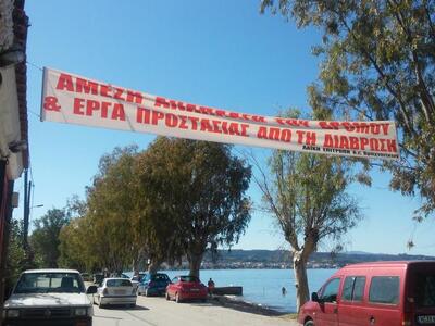 Το πανό που αναρτήθηκε πρόσφατα στο σημείο γράφει: «Άμεση ανάπλαση του δρόμου και έργα προστασίας από τη διάβρωση».