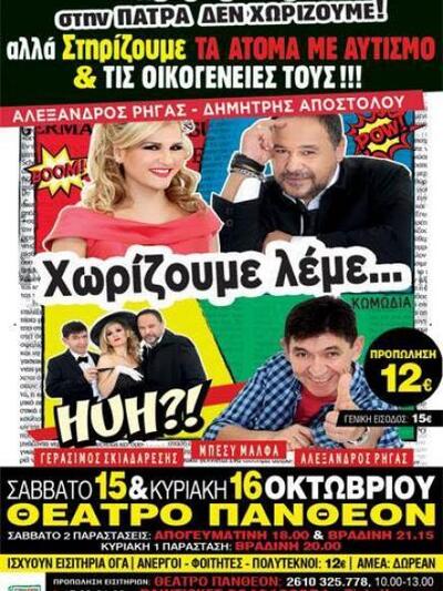 Στην Πάτρα και στο θέατρο "Πάνθεον" καταυθάνει η παράσταση "Χωρίζουμε λέμε". Θα δοθούν τρεις παραστάσεις στις 15 και 16 Οκτωβρίου με σκοπό την στήριξη των ατόμων με αυτισμό.
