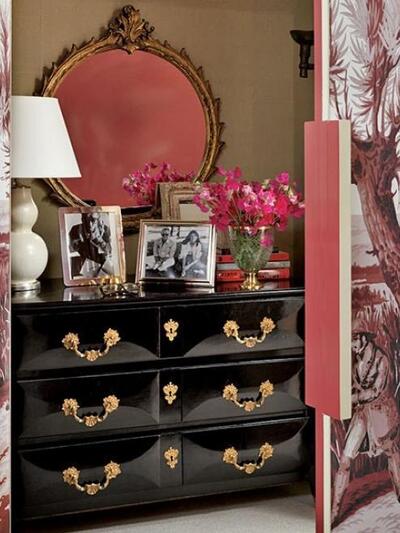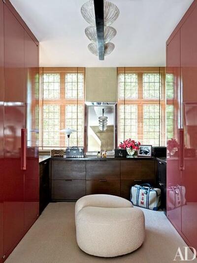 Για τους προσωπικούς της χώρους, κρεβατοκάμαρα, βεστιάριο, γραφείο η Ναταλί επιτρέπει το πολύ γυναικείο, βαθύ ροζ. Εμάς πάντως μας έκανε εντύπωση και η άπλα και το ύφος του μαρμάρινου κατάλευκου μπάνιου…