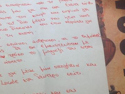Ένα γράμμα από μία Localίτισσα που βρήκε ο ιδιοκτήτης, όταν άνοιξε ένα πρόσφατο πρωινό το μαγαζί.