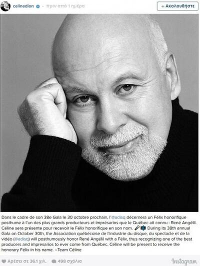 Η Celine Dion θα παραλάβει τιμητικό βραβείο για την προσφορά του συζύγου της, Rene Angelil, ο οποίος έφυγε από την ζωή πριν από εννέα μήνες, νικημένος από τον κακρίνο του λάρυγγα. Θέλοντας να τιμήσουν την προσφορά του Rene Angelil στην μουσική βιομηχανία, οι Καναδοί διοργανωτές των βραβείων Felix θα τον τιμήσουν μετά θάνατον, στην απονομή που θα γίνει αυτή την Κυριακή, 30 Οκτωβρίου, στο Κεμπέκ.
