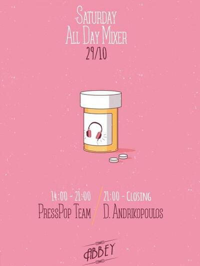 Το Abbey φιλοξενεί στα decks του την ομάδα του Presspop.gr, οι οποίοι από τις 15:00 θα συνοδεύσουν με τις μουσικές επιλογές τους από όλο το φάσμα της εναλακκτικής pop και rock νουσικής, το ποτό ή το φαγητό σας.