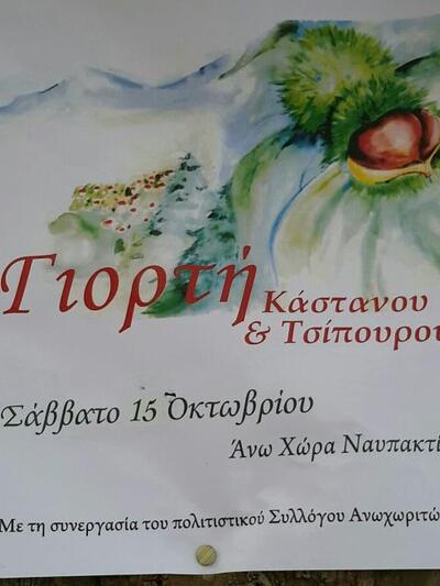 Η γιορτή του κάστανου και τσίπουρου οργανώνεται το τρίτο Σάββατο του Οκτώβρη στην πλατεία της Άνω Χώρας με πολλές εκδηλώσεις. Στήνονται ψησταριές που κερνάνε κάστανα στους επισκέπτες , ρακοκάζανα που τους φιλεύουν ρακί, οι Παραδοσιακοί χοροί έχουν την τιμητική τους και τα μαγαζιά μαγειρεύουν κάστανα σε γλυκές και αλμυρές εκδοχές.