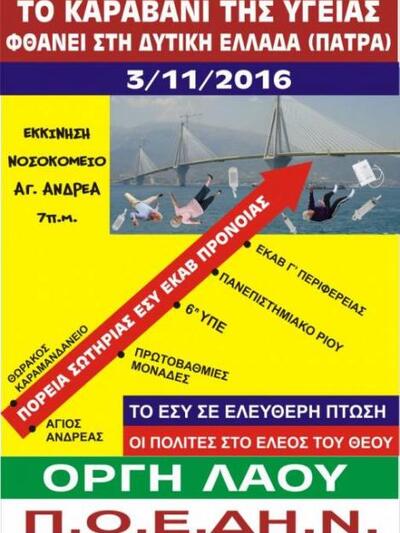 Το καραβάνι υγείας έρχεται στην Πάτρα την Πέμπτη 3 Νοεμβρίου για να αναδείξει τα πολλά προβλήματα και τις ελλείψεις που αντιμετωπίζει η δημόσια υγεία και στη Δυτική Ελλάδα. Θα γίνει μια πορεία 12 περίπου χιλιομέτρων, από το Νοσοκομείο του Αγίου Ανδρέα, μέχρι και τη Γέφυρα Ρίου-Αντιρρίου, εκεί όπου θα γίνει ένα συμβολικό χάπενινγκ, που θα έχει ως σενάριο την πτώση των κυβερνώντων στη θάλασσα.