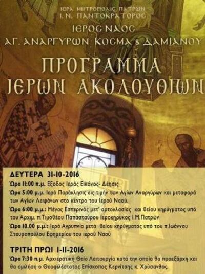 Στον ιερό ναό των Αγίων Αναργύρων Πατρών, την Δευτέρα 31/10, τελέστηκε στις 5 το απόγευμα ιερά παράκληση και ακολούθησε ο πανηγυρικός εσπερινός μετ’ αρτοκλασίας, όπου παρέστη και κήρυξε το Θείο λόγο ο αρχιμανδρίτης π. Τιμόθεος Παπασταύρου. Στην ιερά αγρυπνία το βράδυ το Δευτέρας λειτούργησε ο π. Ιωάννης Σταυρόπουλος του ιερού ναού του Παντοκράτορα και των Αγίων Αναργύρων.