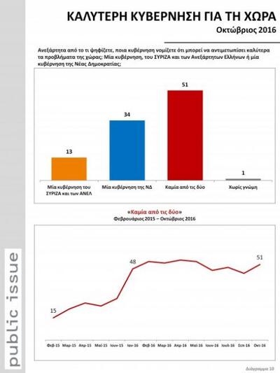 Στην ερώτηση για το ποια θεωρούν οι ψηφοφόροι καλύτερη κυβέρνηση για τη χώρα, το 34% απαντάει μια κυβέρνησης της ΝΔ, το 13% μια κυβέρνηση ΣΥΡΙΖΑ – ΑΝΕΛ, με το 51% να λέει «καμία από τις δύο».
