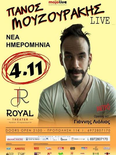 Μετά την επιτυχία που σημείωσαν οι καλοκαιρινές εμφανίσεις του, ο ιδιαίτερος Πάνος Μουζουράκης συνεχίζει την περιοδεία του κάνοντας στάση στην Πάτρα και στο Royal Theater Patras την Παρασκευή 4 Νοεμβρίου.