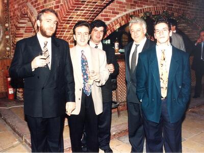 Τον βλέπουμε εδώ πρώτο από αριστερά και δίπλα του τους δημοσιογράφους Μαρίνο Ζώη, Σταύρο Παναγόπουλο, Θανάση Μπαμπανέβα και Τάσο Αγγελόπουλο. Στο βάθος δεξιά διακρίνεται ο αείμνηστος Πάνος Τζαβάρας.