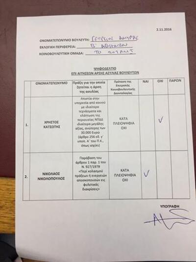 Ένας εκ των βουλευτών που πήρε μέρος στην ψηφοφορία ανέβασε φωτογραφία με το ψηφοδέλτιο. Πρόκειται για τον Αμυρά του Ποταμιού που ψήφισε υπέρ της άρσης ασυλίας του Νικολόπουλου.