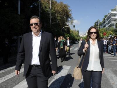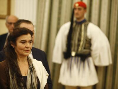 Εντυπωσιακή ήταν η εμφάνιση της κας. Κόλλιας-Τσαρουχά, η οποία κινήθηκε σε λίγο πιο έντονα χρώματα, φορώντας μπλε παλτό και πουά πράσινο-μπλε φόρεμα.